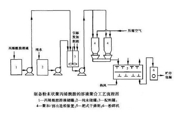 丙烯酰胺+水(引发剂/聚合)→聚丙烯酰胺胶块→造粒→干燥→粉碎→聚丙烯酰胺产品